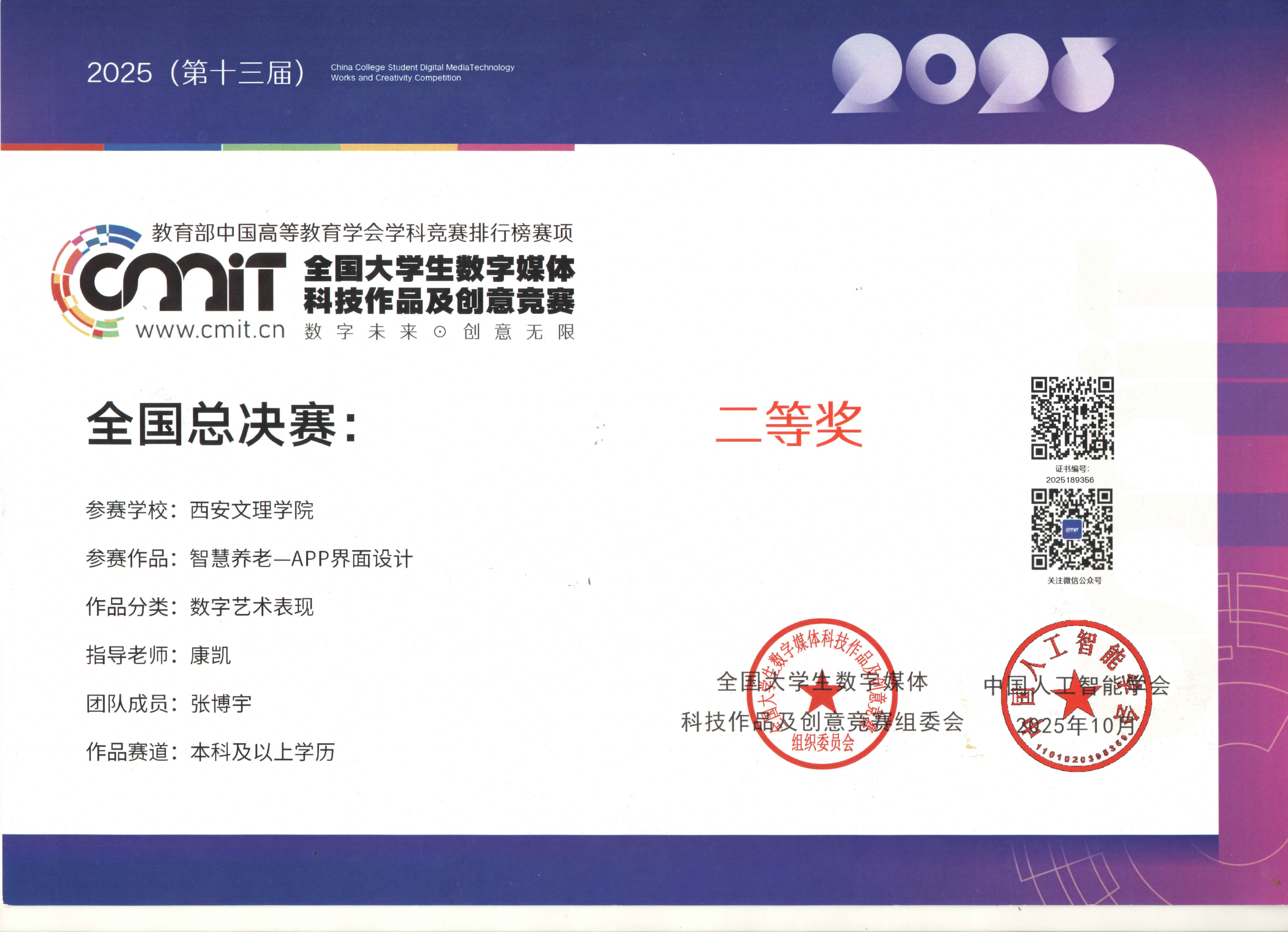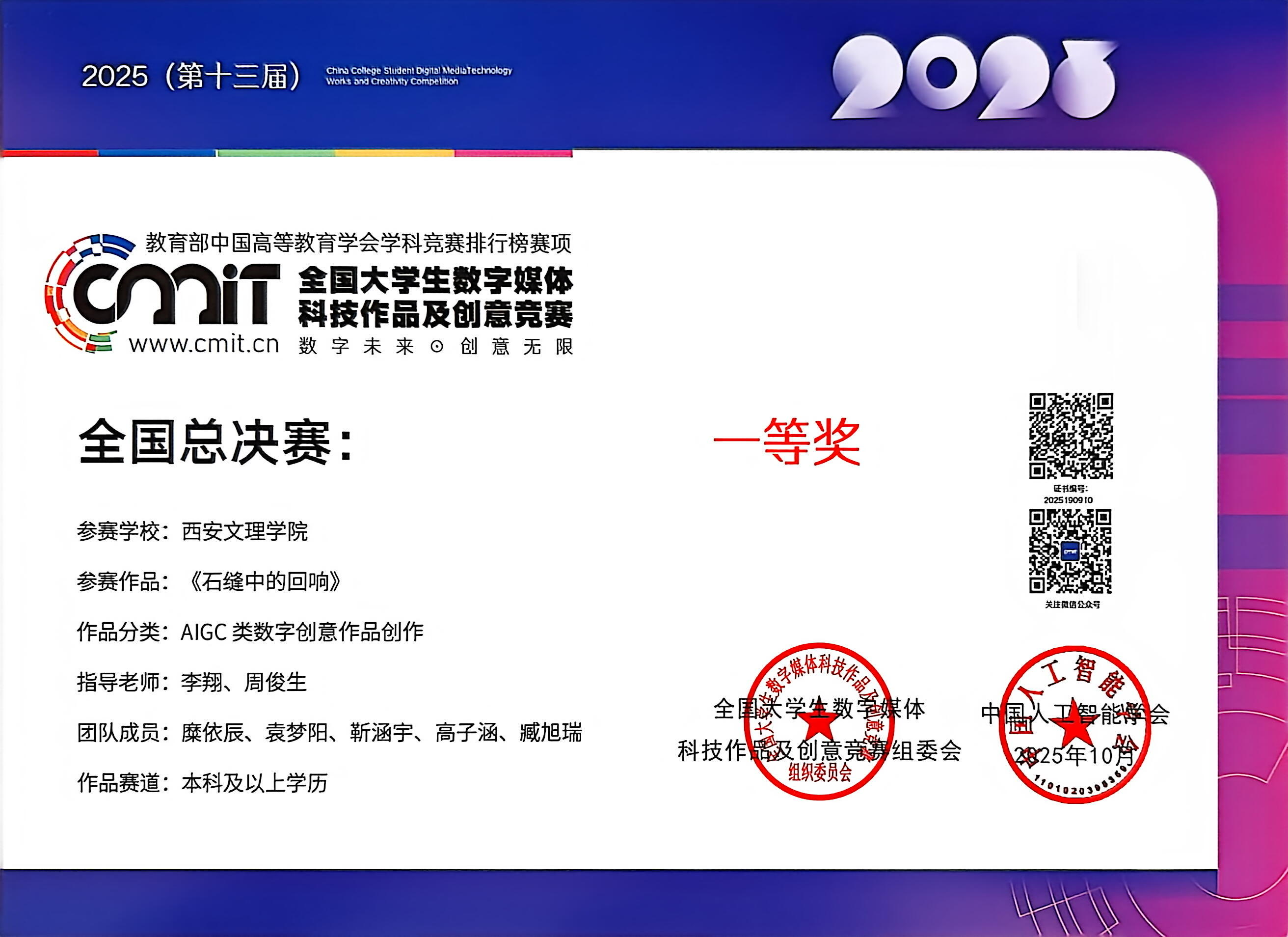 此次全国大学生数字媒体科技作品及创意竞赛是在全面贯彻落实党的二十大精神、推进“教育强国、科技强国、人才强国”战略背景下举办的全国性高水平学科竞赛,吸引了全国众多高校师生的积极参与。美术与设计学院获奖师生立足自身学科特色,将教师科研项目、教改与专业教学深度融合,通过创新实践教学将地域文化与专业知识深度融合:依托“走读秦岭”项目,以数字技术创新展现本土文化魅力;结合省级创新创业在线开放课程《产品开发设计》钻研陕西地域优秀传统文化元素,运用动态影像、AIGC等手法实现文化表达的当代转化;基于“AIGC与非遗传承”等研究方向,引导学生关注社会现实问题,运用数字艺术语言传递人文关怀。参赛作品既展现了我校学子扎实的专业能力,也体现了“以创促学、以美育人”的教学理念。